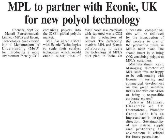 Manali Petrochemicals Limited (MPL) is a petrochemical company developing innovative products, since 1986, that find application in a variety of industries such as appliances, automotive, bedding, food & fragrances, furniture, footwear, paints and coatings, and pharmaceuticals.